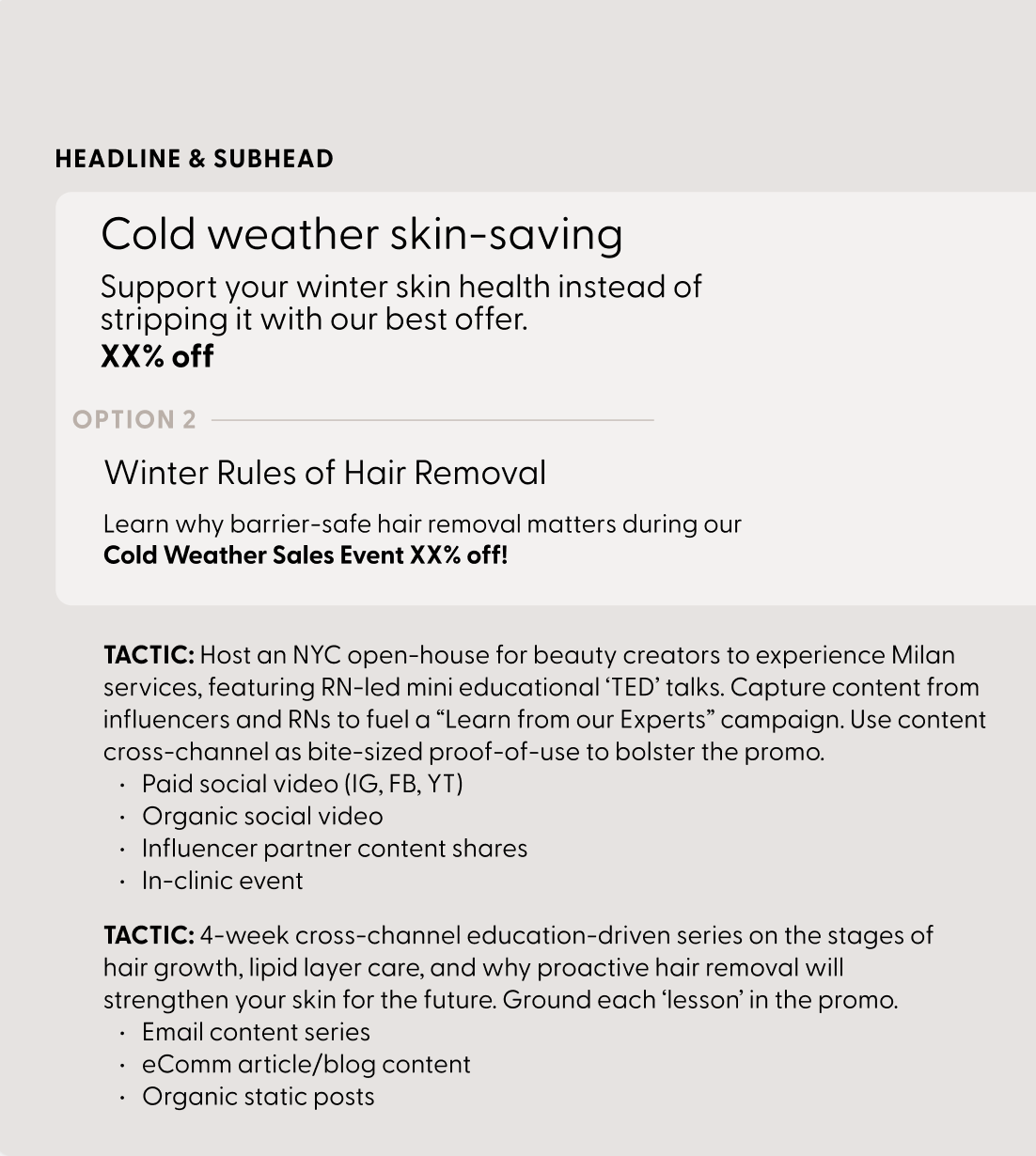 Include cross-channel tactics: Paid media, organic, influencer, in-clinic.