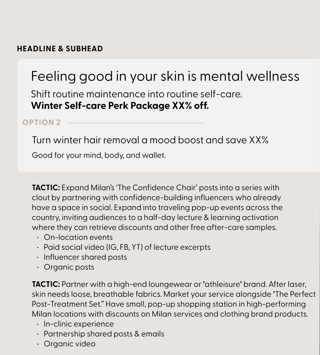 Abbreviated market research reveals limited insights on national laser hair removal-centric companies, positioning Milan as a standout brand. Most category promotions focus on promo without providing education to new acquisition customers and reason to believe.